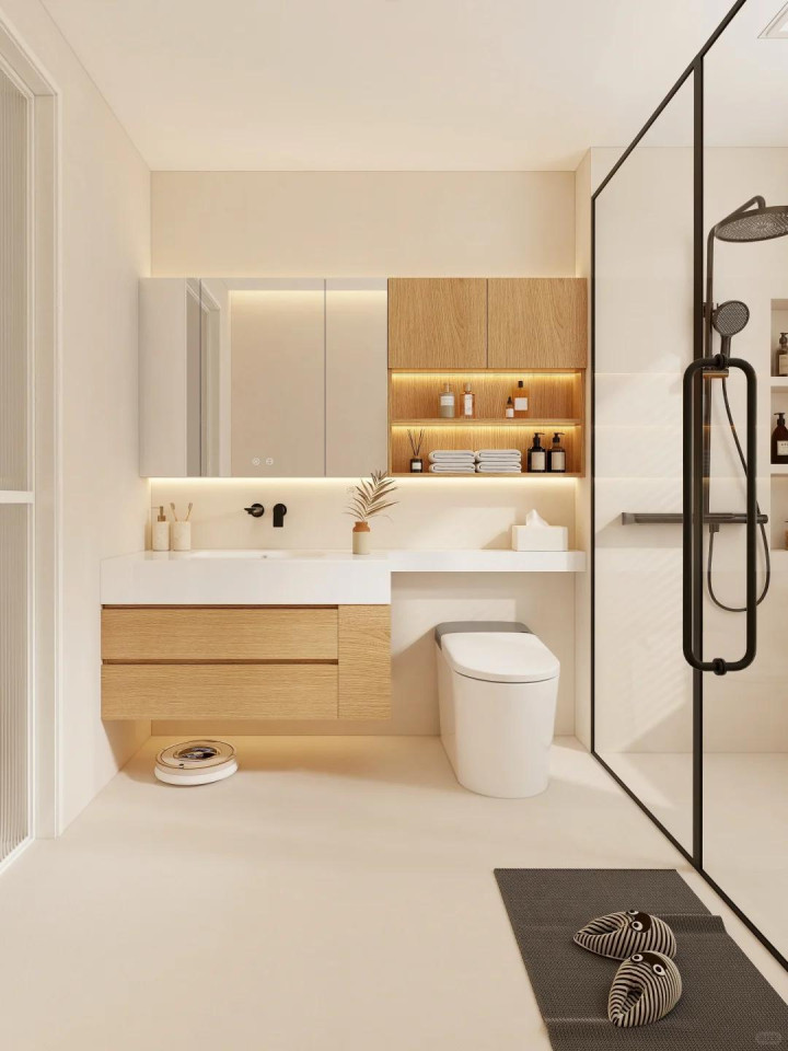 氛围照明: 淋浴区壁龛内嵌灯带、地脚感应灯,营造柔和层次与高级感。
