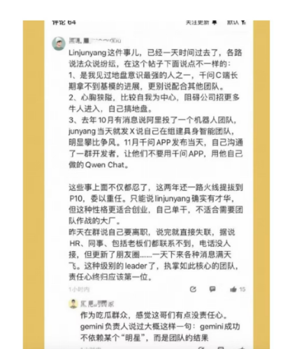 网络上亦有阿里员工发文,称林俊旸“地盘意识强”,在团队协作中存在一定沟通壁垒,对资源协调与合作推进造成影响。文章还提及林俊旸在离职后一度失联,引发内部关注。不过,这些说法尚未得到官方证实。
