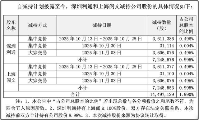 大股东方面,2025年10月13日—11月3日,深圳利通、上海阅文,以集中竞价方式和大宗交易的方式,合计减持1449.71万股,占公司总股本的1.99%。