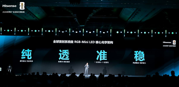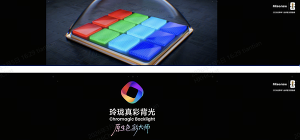 作为 RGB-Mini LED 电视的开创者与引领者,海信深耕高端显示技术迭代,直击行业 “色彩受限、光晕难消、还原不准、久用褪色” 四大痛点,为 UX2026 款打造全球首创玲珑 4 芯真彩背光技术,以 “纯、透、准、稳” 的技术优势实现 1 区控色>3 区控光的颠覆式突破,从根源上解决普通Mini LED串色、色晕、偏色等行业顽疾,推动电视画质正式迈入原生色彩时代。